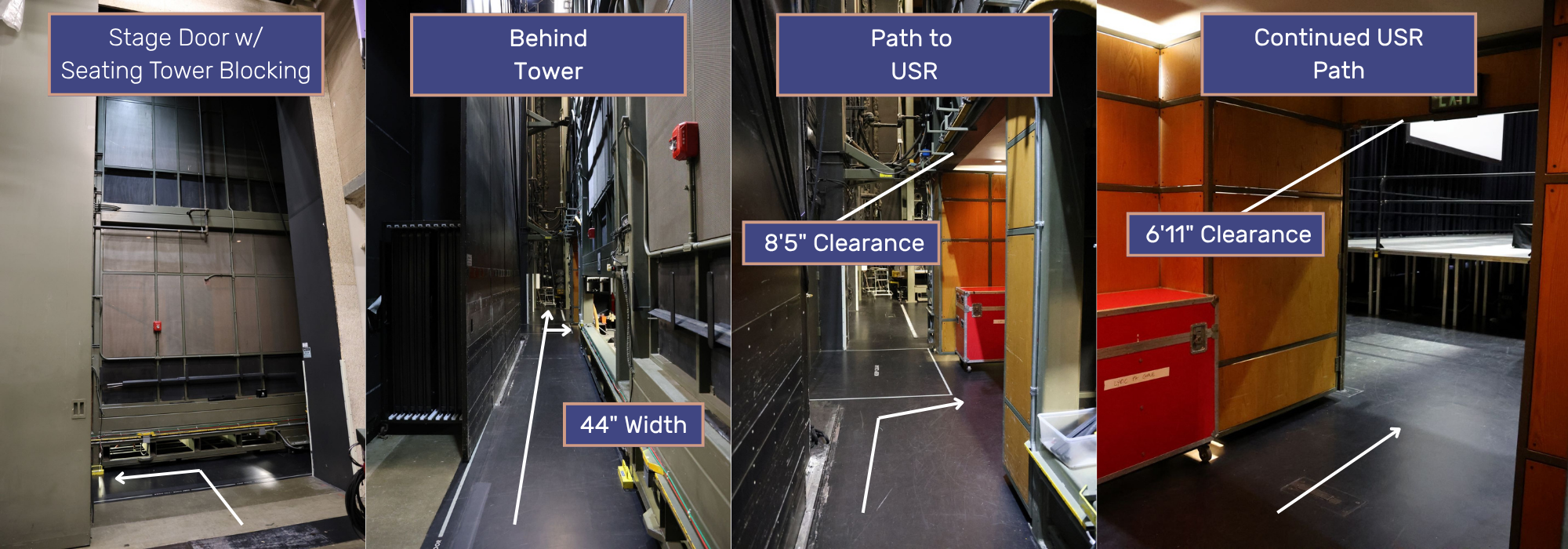 From the trucks, equipment will make a 90 degree turn through the loading door, through the scene storage area, and into theater from the stage right side. "In-the-round" configurations (Arena, Concert, Cabaret) place significant restrictions on loading in large items (5’ 10" W x 6’ 10" H or 4’ W x 8’-5" H depending on access; please refer to images below) because the inside loading door is blocked by